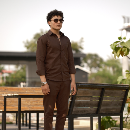 Brown - Cotton Linen Co-ord Set - Full Shirt Full Pant