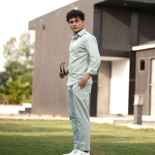 Dusty Blue - Cotton Linen Co-ord Set - Full Shirt Full Pant