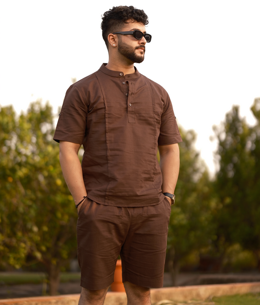 Brown - Cotton Linen Co-ord Set - Half Pant Half Shirt