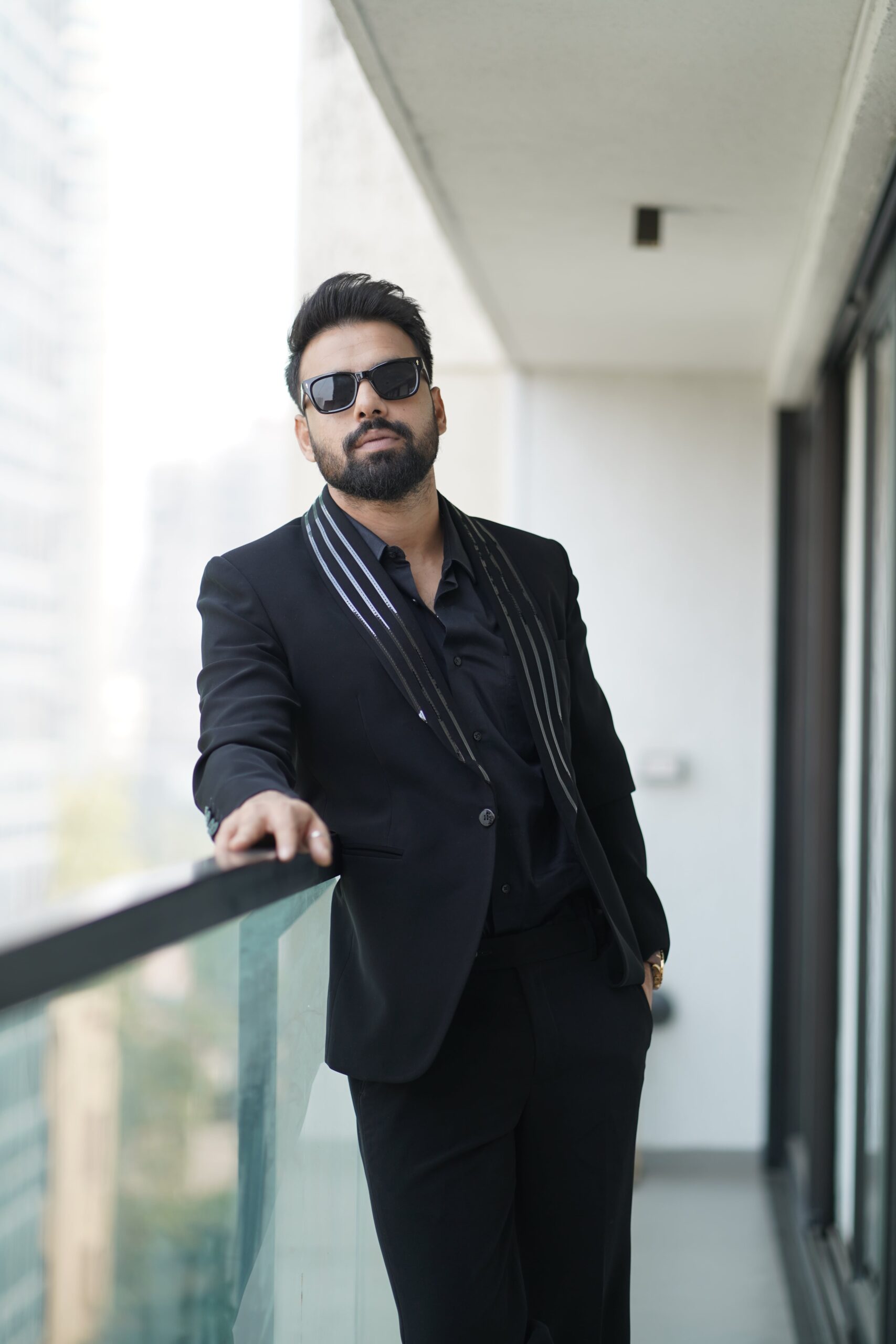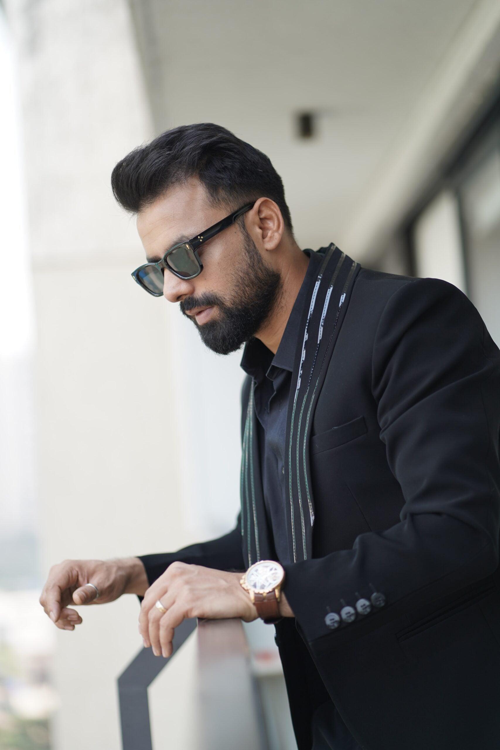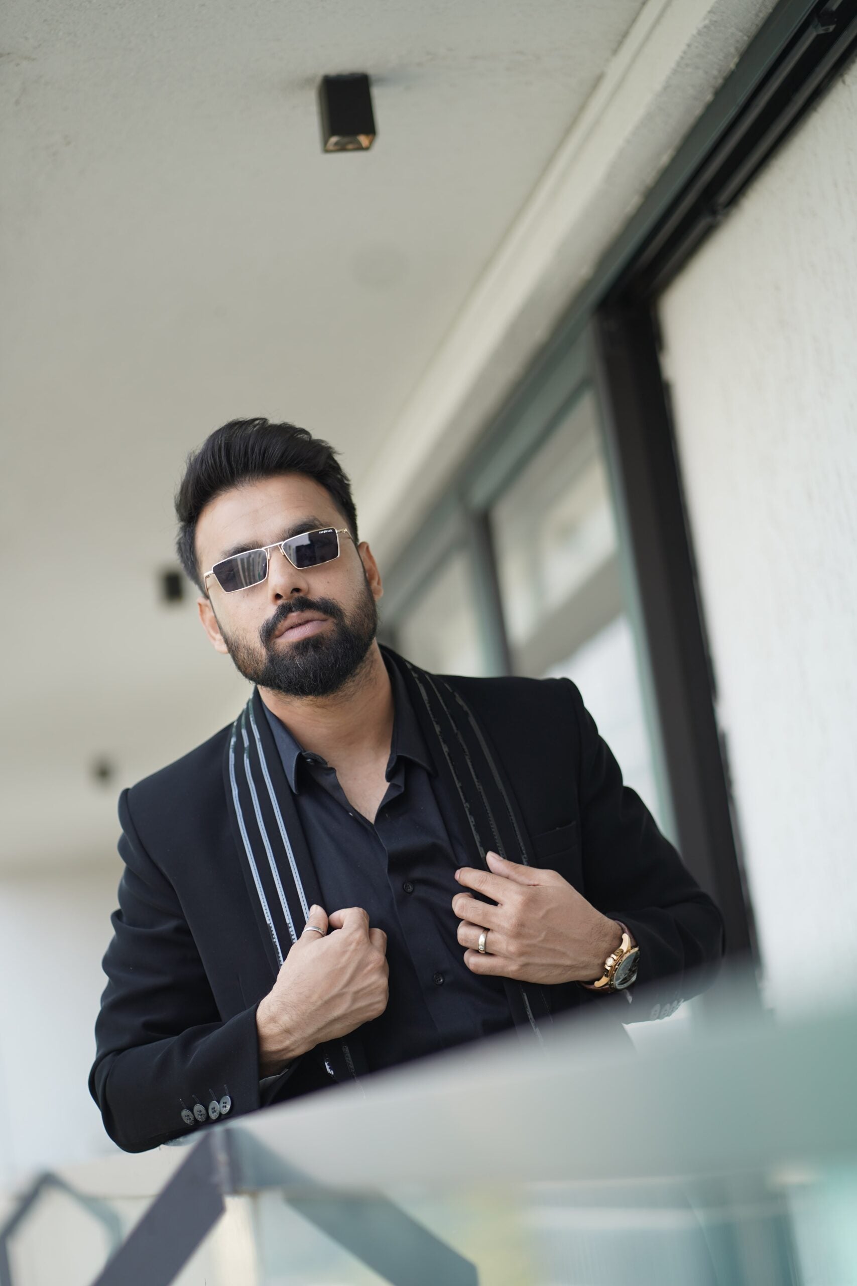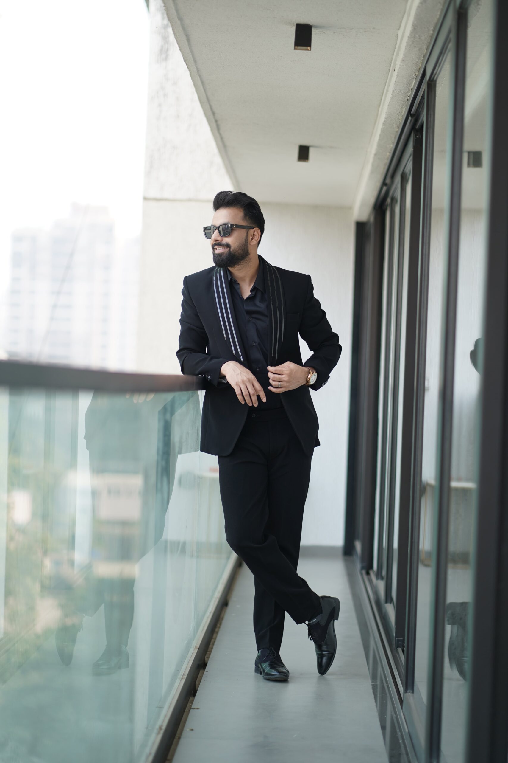 Introducing our Black Tuxedo Metallic Stripe ensemble, a fusion of contemporary style and classic sophistication. This black tuxedo features a sleek metallic stripe on the collar, perfectly paired with a black shirt and matching pants. Ideal for wedding functions like sangeet, shadi, or receptions, the ensemble is crafted from four-way stretchable imported suiting fabric.