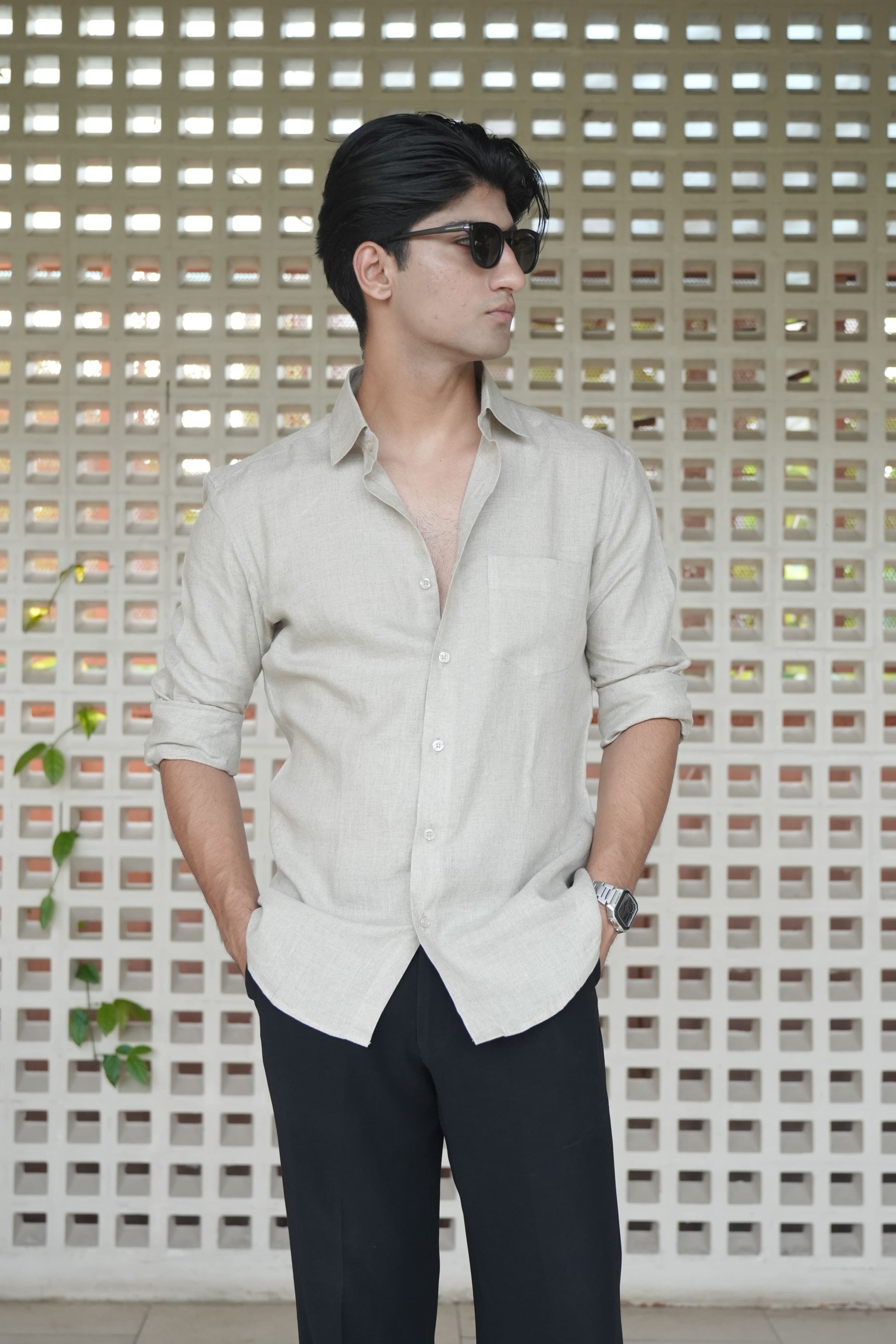The shirt is crafted from 100% linen, prized for its airy texture and cooling properties. Its versatile neutral tone makes it an everyday essential β from lounge hours to cultural celebrations or office routines β promising effortless elegance with ease.