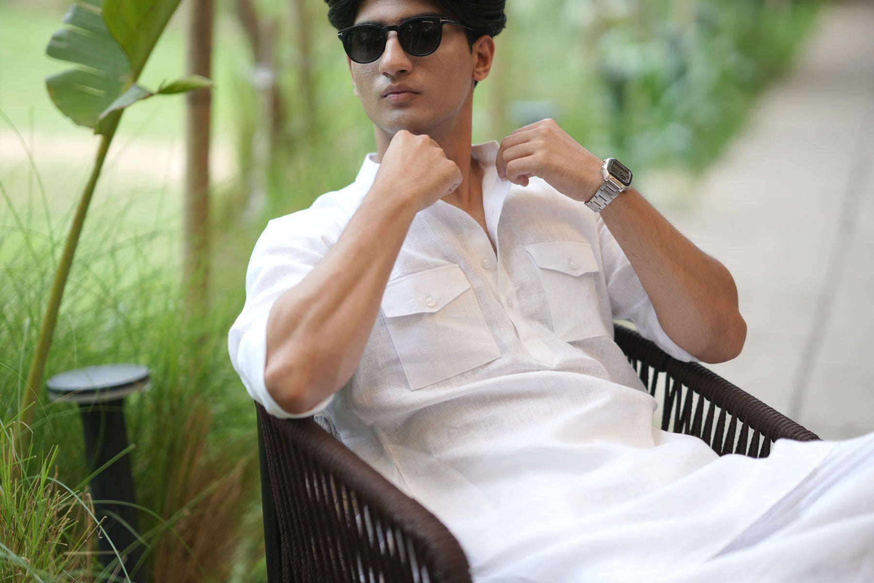 An ensemble that exudes understated elegance and versatility. The kurta includes a double pocket flap, paired with a pyjama featuring a side elastic waist and two functional pockets, creating a classic and comfortable design.